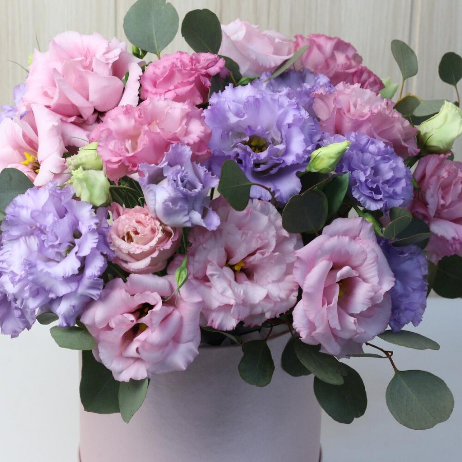 Букет из 15 розовых и сиреневых эустом в коробке в Рыбинске