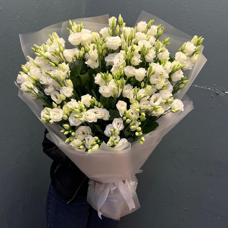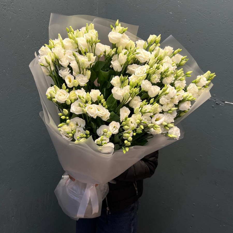 На фото монобукет из 21 белой эустомы. В составе: эустома (лизиантус) 21 шт, дизайнерская упаковка 2 шт, атласная лента 1 шт, . Все цветы свежие и ароматные, букет красиво оформлен и отлично подходит для подарка. Доступна доставка цветов или самовывоз.