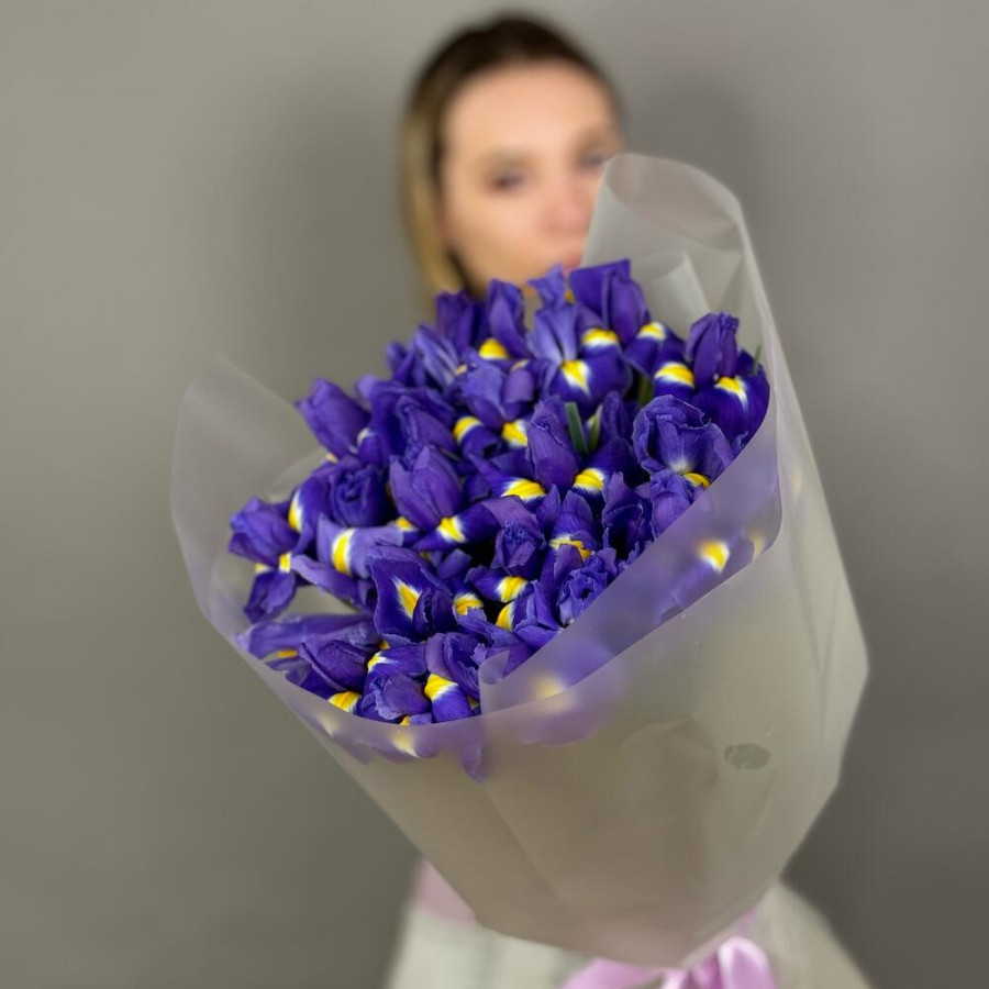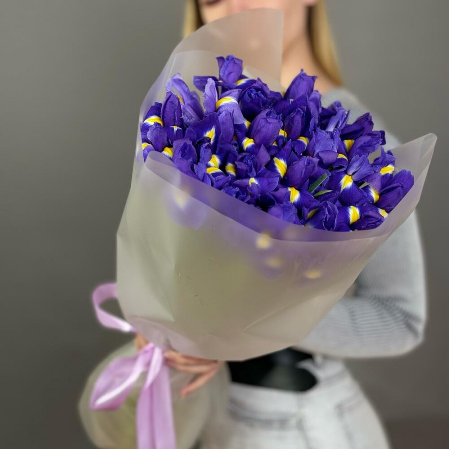 На фото букет из 21 синего ириса. В составе: ирис 21 шт, дизайнерская упаковка 1 шт, атласная лента 1 шт, . Все цветы свежие и ароматные, букет красиво оформлен и отлично подходит для подарка. Доступна доставка цветов или самовывоз.