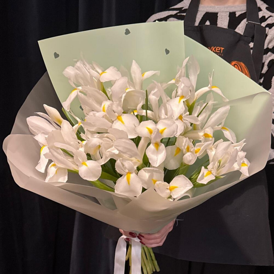 На фото букет из 23 белых ирисов. В составе: ирис 23 шт, атласная лента 1 шт, дизайнерская упаковка 1 шт, . Все цветы свежие и ароматные, букет красиво оформлен и отлично подходит для подарка. Доступна доставка цветов или самовывоз.