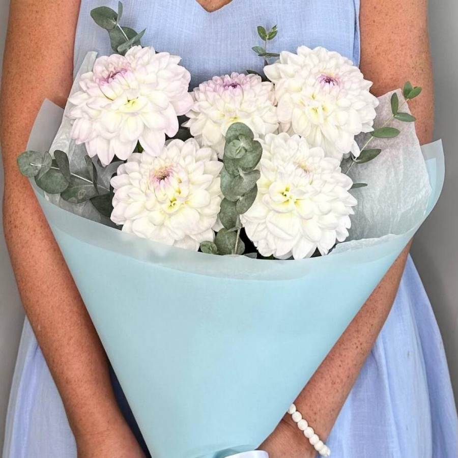 На фото букет из 5 белых георгин с эвкалиптом. В составе: георгина 5 шт, эвкалипт 2 шт, дизайнерская упаковка 1 шт, атласная лента 1 шт, . Все цветы свежие и ароматные, букет красиво оформлен и отлично подходит для подарка. Доступна доставка цветов или самовывоз.