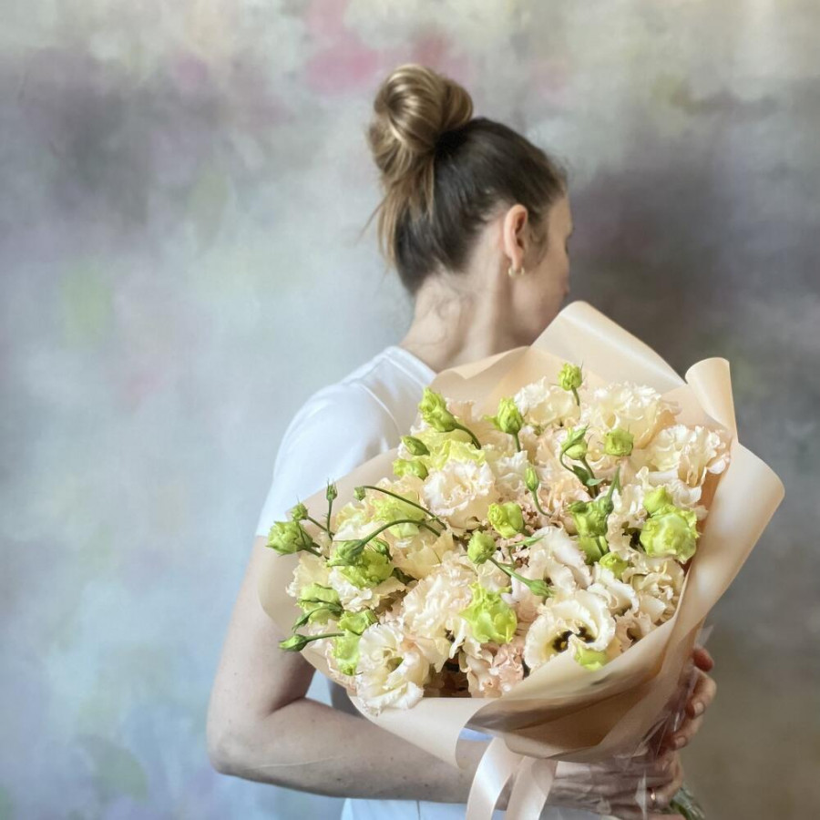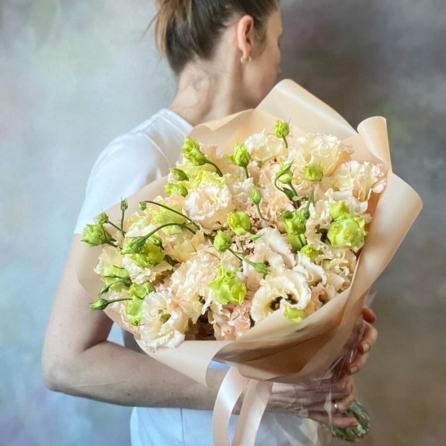 На фото букет 9 персиковых эустом. В составе: эустома (лизиантус) 9 шт, дизайнерская упаковка 2 шт, атласная лента 1 шт, . Все цветы свежие и ароматные, букет красиво оформлен и отлично подходит для подарка. Доступна доставка цветов или самовывоз.