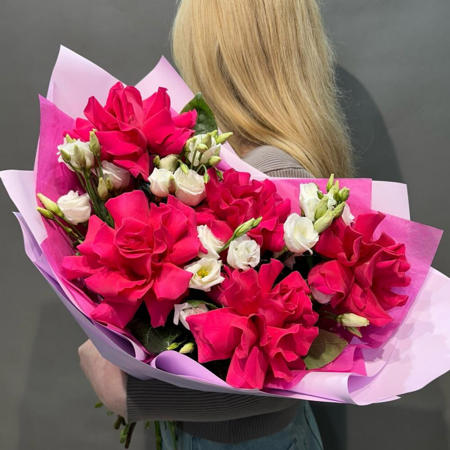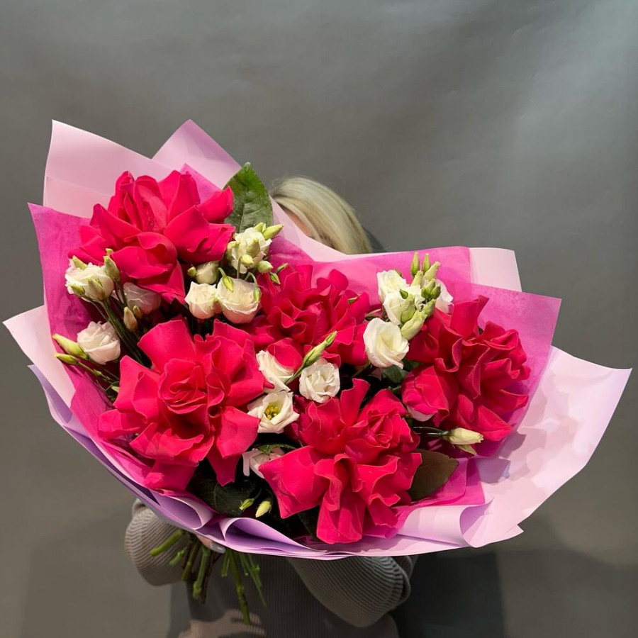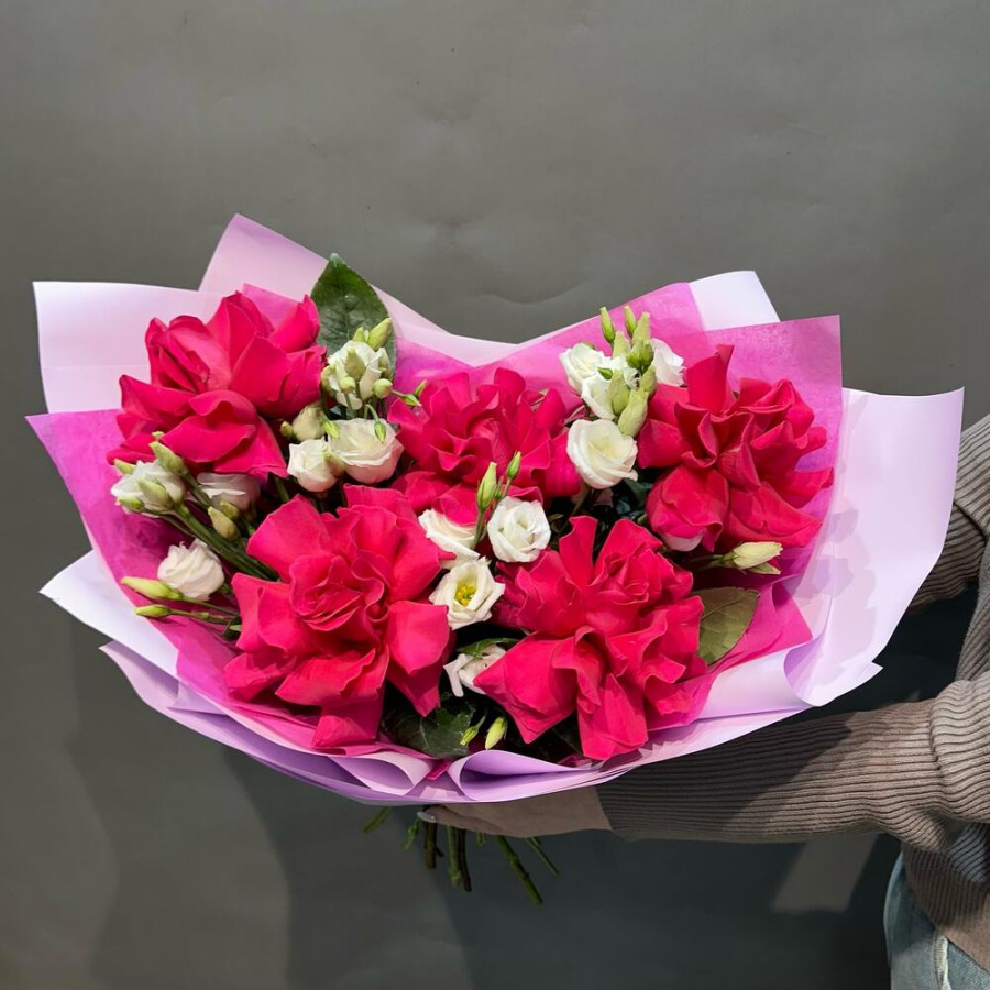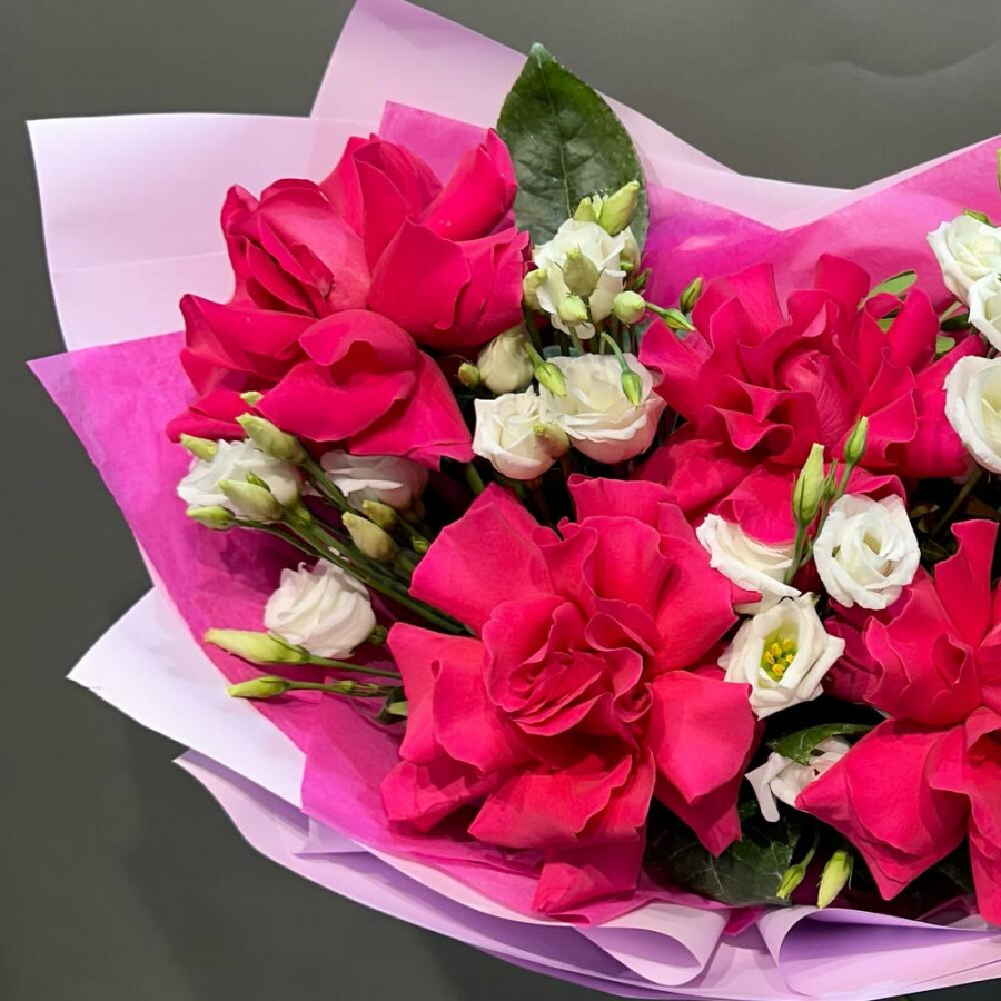 На фото букет из французских роз и белых эустом. В составе: ажурная роза 5 шт, эустома (лизиантус) 4 шт, дизайнерская упаковка 2 шт, атласная лента 1 шт, . Все цветы свежие и ароматные, букет красиво оформлен и отлично подходит для подарка. Доступна доставка цветов или самовывоз.