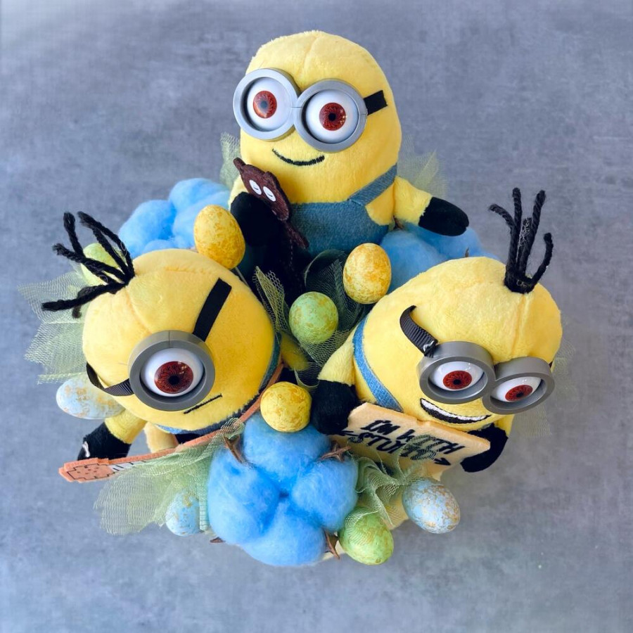 На фото букет из игрушек «миньоны». В составе: . Все цветы свежие и ароматные, букет красиво оформлен и отлично подходит для подарка. Доступна доставка цветов или самовывоз.