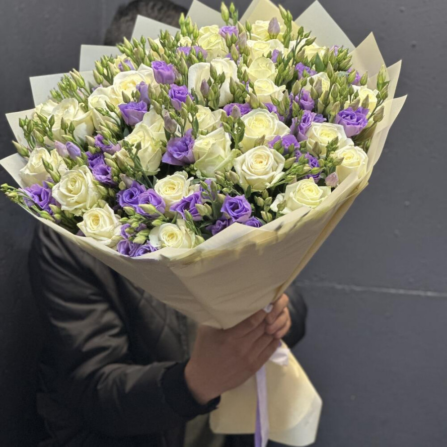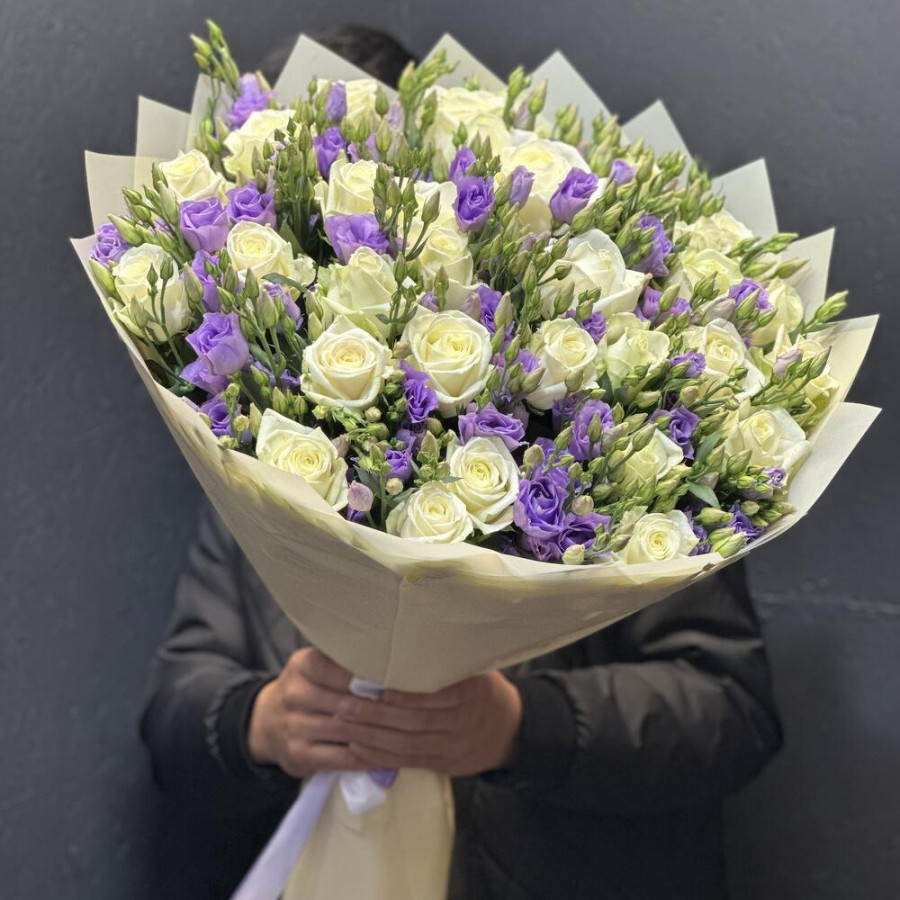 На фото букет из сиреневых эустом и белых роз. В составе: эустома (лизиантус) 21 шт, роза 30 шт, дизайнерская упаковка 3 шт, атласная лента 2 шт, . Все цветы свежие и ароматные, букет красиво оформлен и отлично подходит для подарка. Доступна доставка цветов или самовывоз.