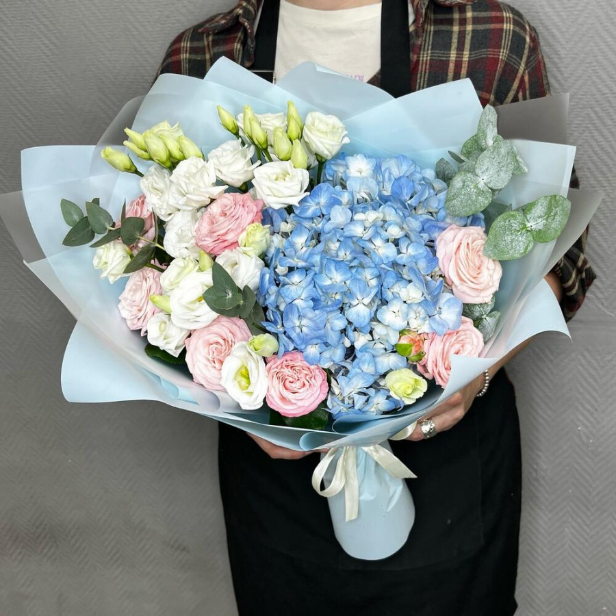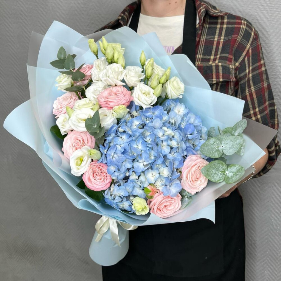На фото букет «ледяная акварель». В составе: гортензия 1 шт, кустовая пионовидная роза 4 шт, эустома (лизиантус) 3 шт, эвкалипт 3 шт, дизайнерская упаковка 1 шт, атласная лента 1 шт, . Все цветы свежие и ароматные, букет красиво оформлен и отлично подходит для подарка. Доступна доставка цветов или самовывоз.