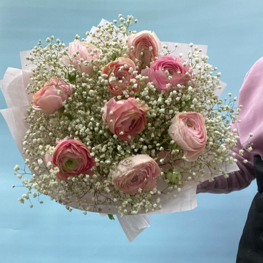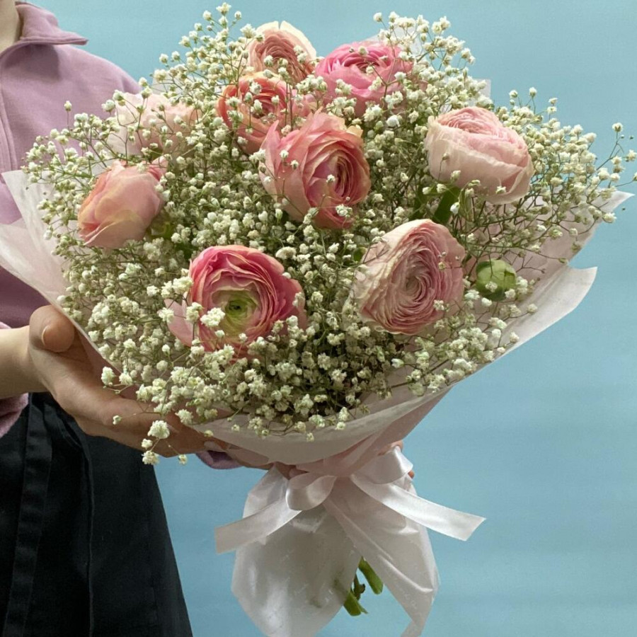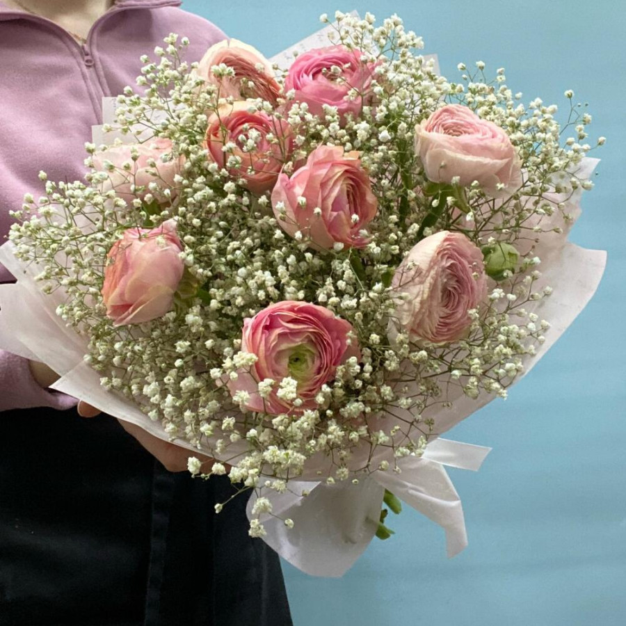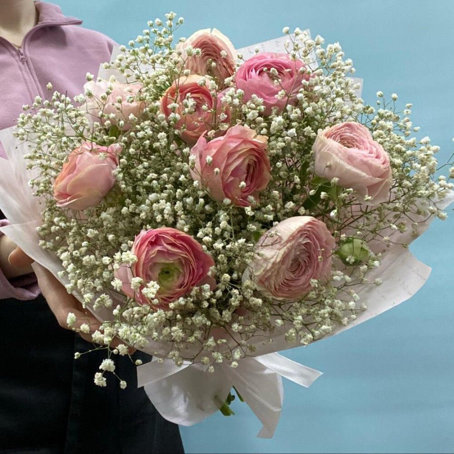 Букет из розовых ранункулюсов с белой гипсофилой в Рыбинске