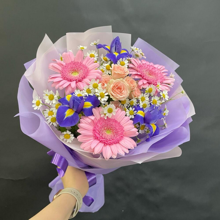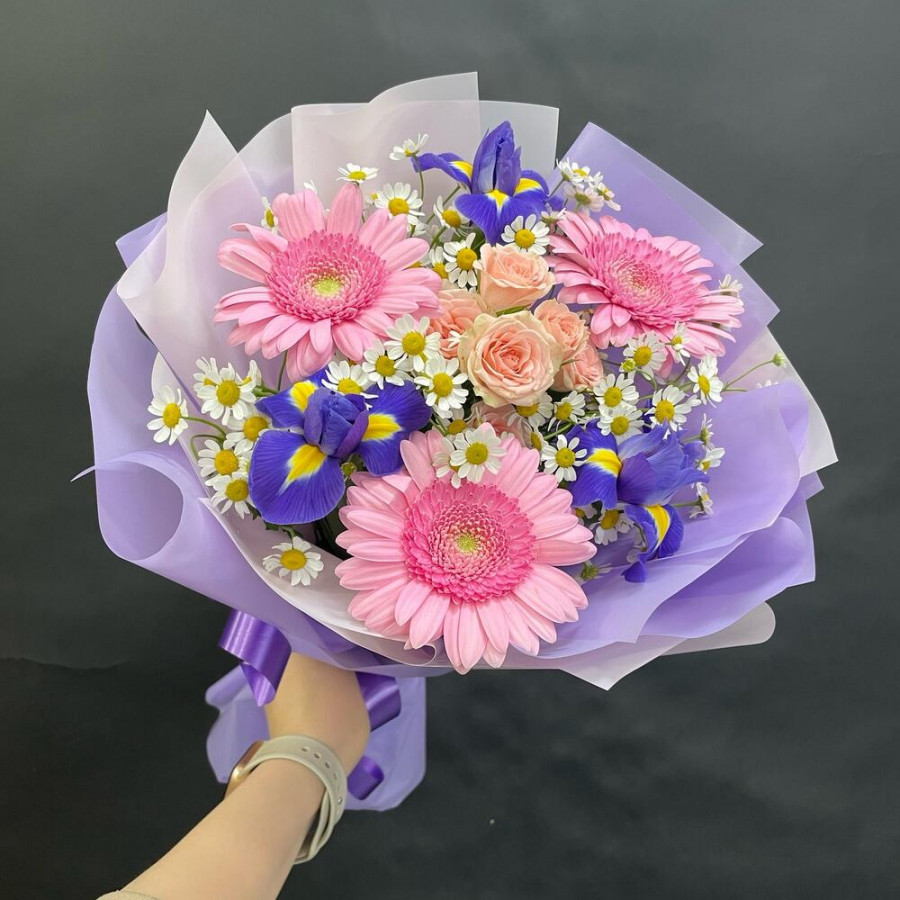 На фото букет из розовых гербер, ирисов и ромашек. В составе: ирис 3 шт, кустовая роза 1 шт, танацетум 3 шт, дизайнерская упаковка 1 шт, атласная лента 1 шт, . Все цветы свежие и ароматные, букет красиво оформлен и отлично подходит для подарка. Доступна доставка цветов или самовывоз.