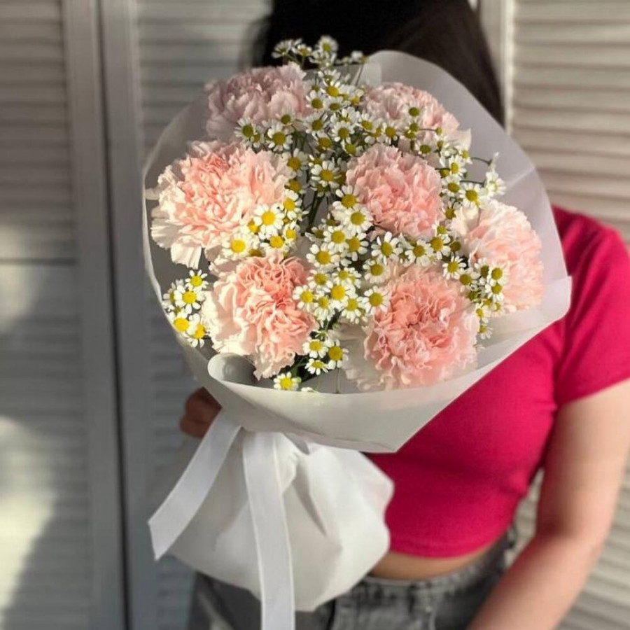 На фото букет «розовый пломбир». В составе: гвоздика 7 шт, танацетум 5 шт, дизайнерская упаковка 1 шт, атласная лента 1 шт, . Все цветы свежие и ароматные, букет красиво оформлен и отлично подходит для подарка. Доступна доставка цветов или самовывоз.