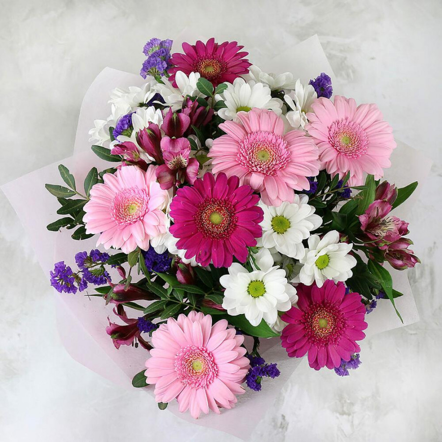 На фото букет «ягодный щербет». В составе: гербера 7 шт, альстромерия 3 шт, хризантема кустовая 4 шт, статица 2 шт, писташ 1 шт, дизайнерская упаковка 1 шт, атласная лента 1 шт, . Все цветы свежие и ароматные, букет красиво оформлен и отлично подходит для подарка. Доступна доставка цветов или самовывоз.