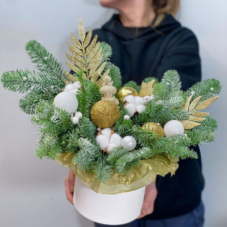 На фото композиция из нобилиса в шляпной коробке. В составе: нобилис 4 шт, хлопок 3 шт, елочная игрушка 7 шт, фетр 1 шт, шляпная коробка (s) 1 шт, . Все цветы свежие и ароматные, букет красиво оформлен и отлично подходит для подарка. Доступна доставка цветов или самовывоз.