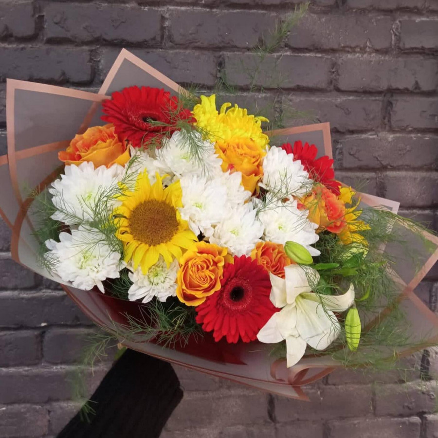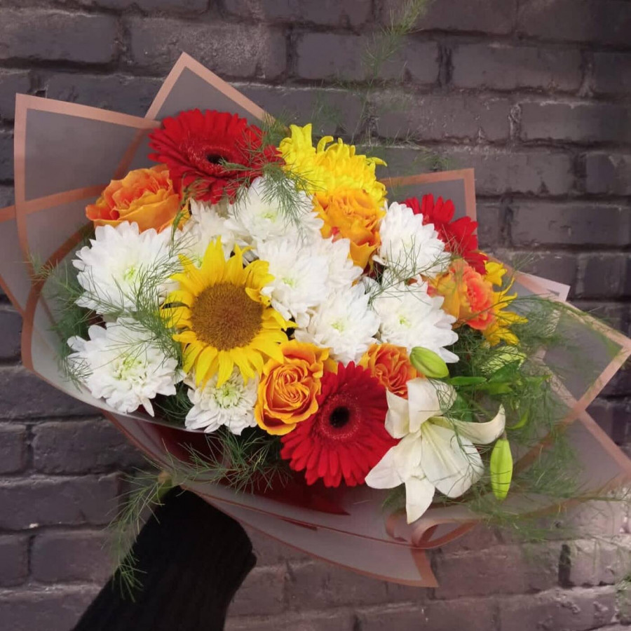На фото сборный букет с лилией. В составе: лилия 1 шт, подсолнух 2 шт, хризантема кустовая 2 шт, гербера 3 шт, роза 3 шт, зелень 1 шт, кустовая пионовидная роза 1 шт, . Все цветы свежие и ароматные, букет красиво оформлен и отлично подходит для подарка. Доступна доставка цветов или самовывоз.